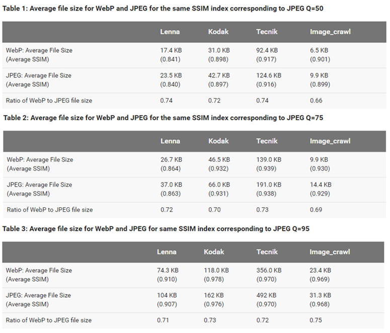这三张表格是谷歌官网对四个图库(Lenna、Kodak、Tecnick、Image_crawl)的图片在相同SSIM(图片相似度)下,JPEG 的质量(Q)分别为50、75、95时,将抽样图片的JPEG格式转为WebP编码后的平均文件尺寸压缩比率表。