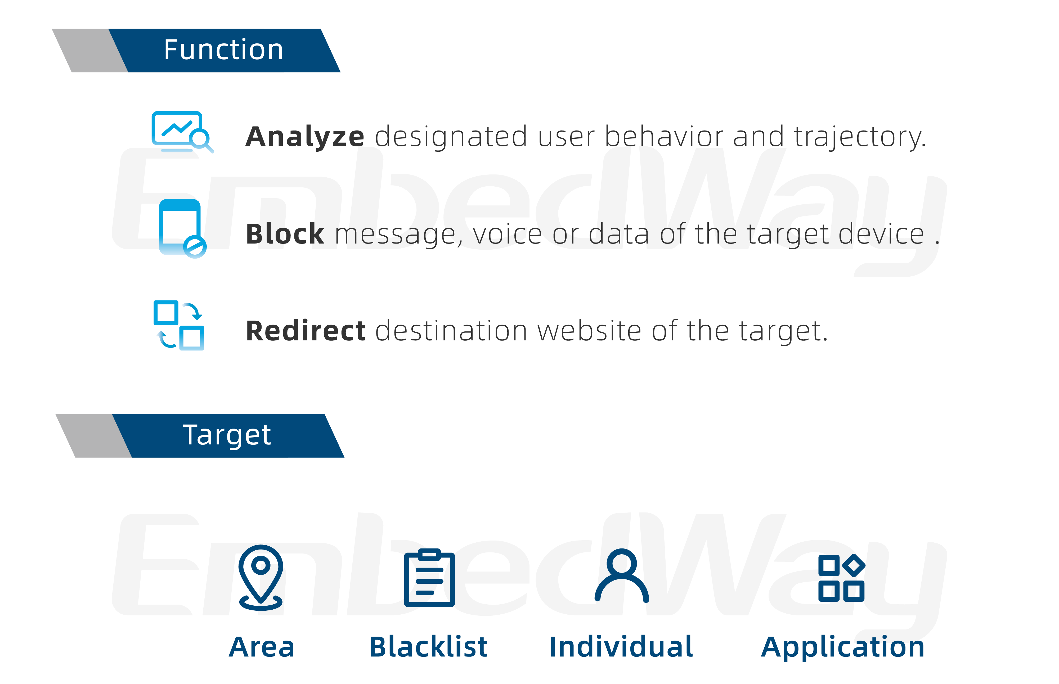 The EmbedWay mobile network interception system is an inline deployment that effectively identifies and analyzes data using various parameters such as regions, individuals, blacklists, or applications. This advanced system enables authorized interception when required, ensuring the utmost mobile network security.